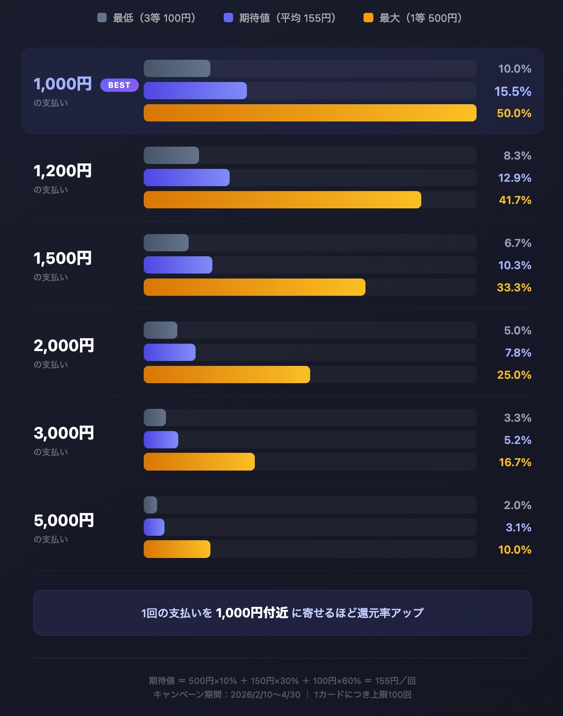 - お得Visaが 「スマホで!タッチでVisa割キャンペーン!」を開催。1等:500円・・・当選確率10% / 2等:150円・・・当選確率30% / 3等:100円・・・当選確率60%。2月10日-4月30日まで。要登録。詳細はこちら。